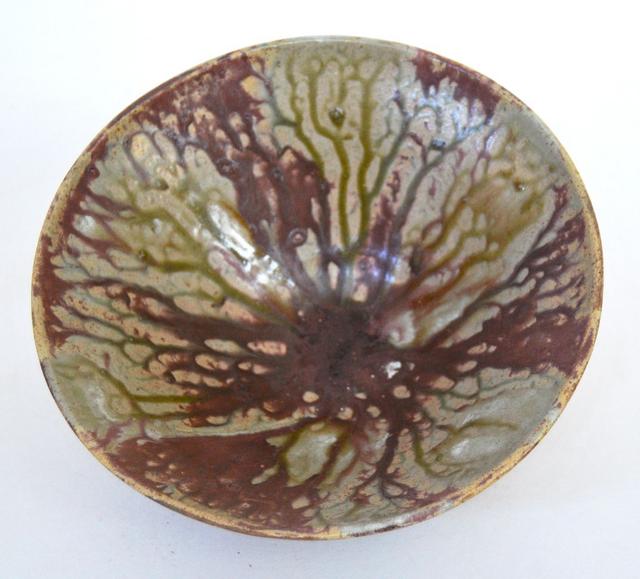This heightened colour comes from contact with olive-wood fuel burned during the firing, The red is a fugitive colour that can also yield yellow. I have used this oxide for many years and don't know its chemical composition but I can hazard a guess from the way it behaves. It can also yield a soft pink on a neptheline syenite glaze fired under reduction. 2010 |